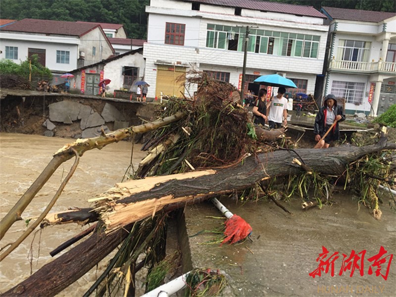 位于马溪村下游的河口村,也遭受山洪袭击。这股洪水冲毁了当地的部分房屋、河堤,甚至将沿河的大树木冲断。当天下午,记者见到,洪水消退后,进村的主要桥梁上,露出多根胸径1尺多长的大树。