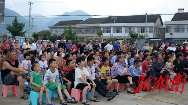在白沙渡村送戏下乡活动现场,由石门县荆河戏剧团精心编排的各类节目,既有优秀的中华传统节目国粹“京剧”,也有中国民歌和器乐的演唱演奏,更有特色民族节目土家族歌舞、常德丝弦,还有贴近时代的时尚节目等,内容丰富,涵盖面广,为村民们送来了文化艺术的盛宴。村民们全程“在线”,时而掌声不断、时而开怀大笑,偶有小雨也没有退却,直到节目完毕才依依不舍离去。