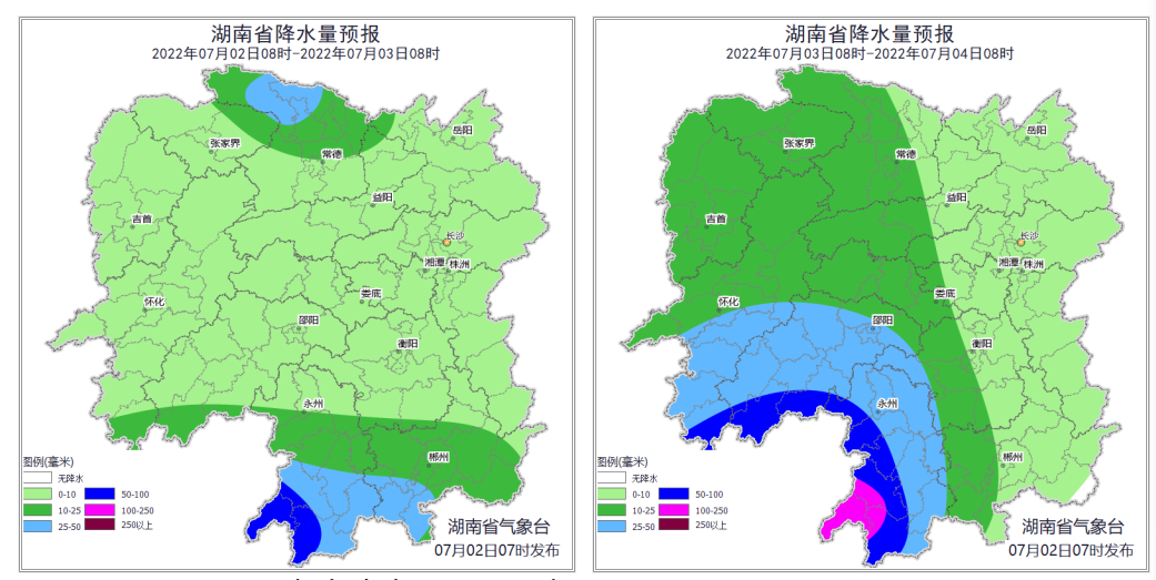(图2  湖南降水量预报 左:7月2日,右:7月3日)