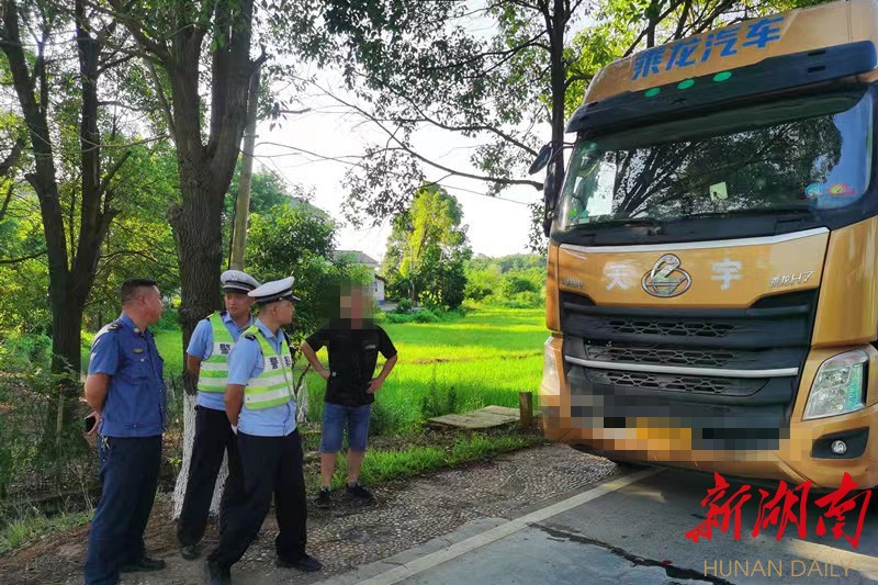 7月19日下午17时许,津市市公安局交通警察大队新洲中队正在新洲镇开展交通问题顽瘴痼疾整治,一辆重型牵引车牵引湘J55**挂重型平板自卸挂车沿省道224由东向西行驶至五泉社区路段时,因非法加装货箱被民警发现,民警立即联系了交通运管部门。在等待交通运管部门的过程中,无独有偶,另一辆重型牵引车牵引车牌号为湘J23**挂的重型平板自卸挂车,也因非法加装货箱被民警发现并查处。交通运管部门到达现场后,交警向其移交相关证据资料,并向当事人陈某、杨某开具了交通违法处理通知书,通知其到交警大队接受处理。