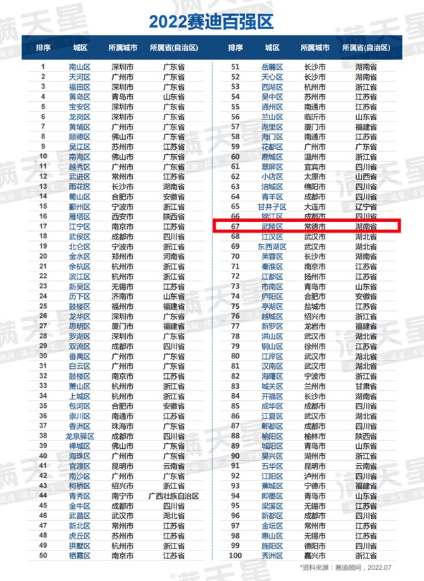 7月27日上午,国家工信部赛迪研究院赛迪顾问发布《2022年中国城区经济高质量发展研究报告暨2022赛迪百强区》,常德市武陵区再次荣登全国百强区榜单第67位,位列中部地区非省会第一区,湖南省入围此次百强榜单的还有长沙市雨花区(13位)、岳麓区(51位)、天心区(52位)、芙蓉区(70位)、开福区(84位)。