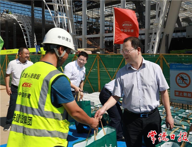 8月13日上午,常德市委副书记、市长周振宇前往常德火车站,代表常德市委市政府慰问在高温下坚守岗位的铁路建设者,并主持召开座谈会调度高铁建设。周振宇强调,相关部门单位要积极履职、主动服务、全力支持,切实营造良好的施工环境,确保常益长高铁年底建成通车。