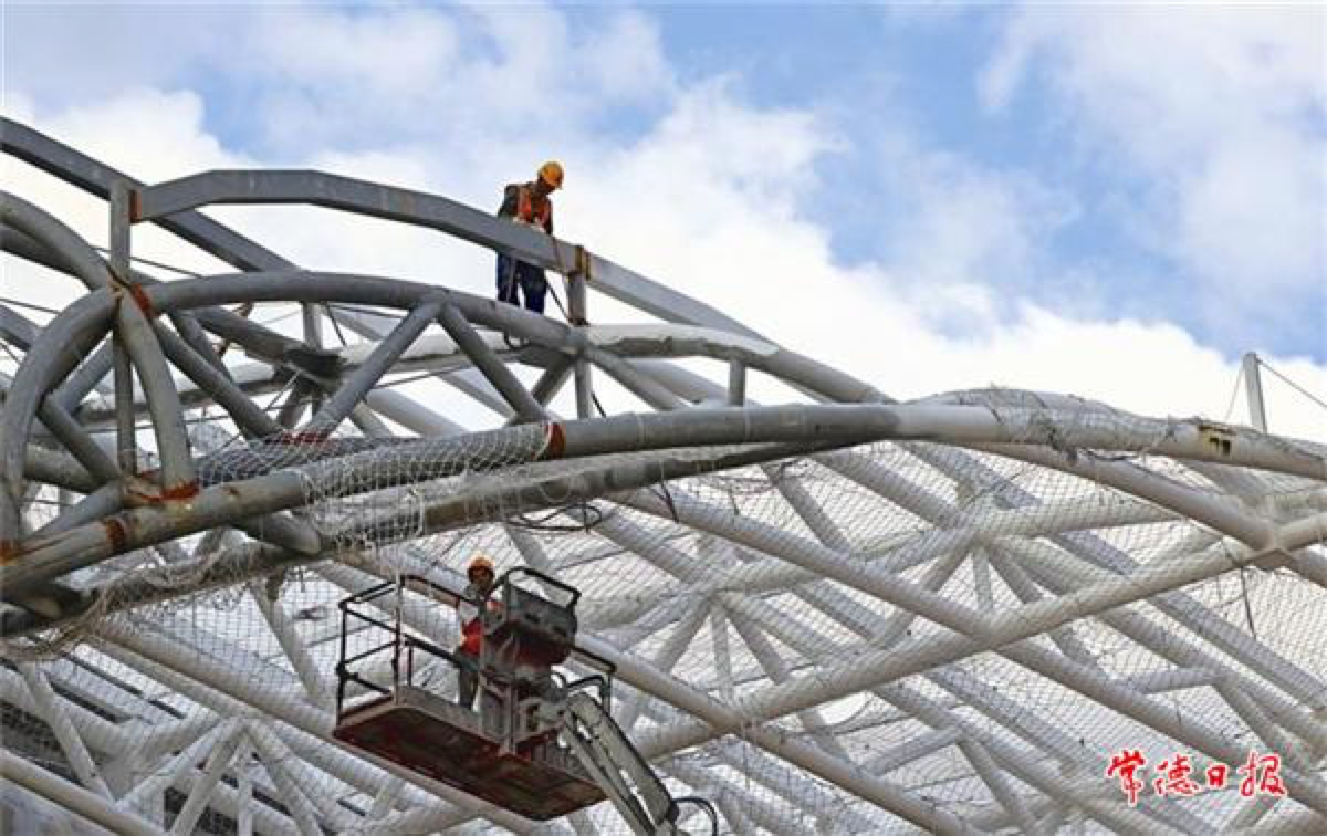 (两位建设者在常德高铁站站房上进行高空作业。)