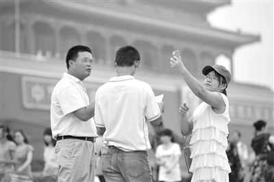 昨日,北京天安门地区,一男子(左)正向游客推荐一日游内容。新京报记者 侯少卿 摄