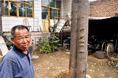 6月下旬,刘林保说,树上的疤痕是儿子刘会杰2009年发病时用刀砍下的。