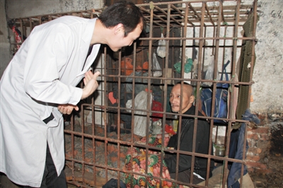 刘跃贵已经在笼中生活了10年,图为2009年3月,医院救助时的场景,但从医院回家的刘跃贵又回到笼子里。