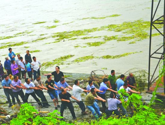 7月10日,岷江青神段,时逢洪峰过境,下游约4公里处就是岷江大桥。如果不拦截住失控的抽沙船,船必撞桥。上百名抢险人员合力拦截。最后,在距离岷江大桥1公里处,船被拦截上岸。