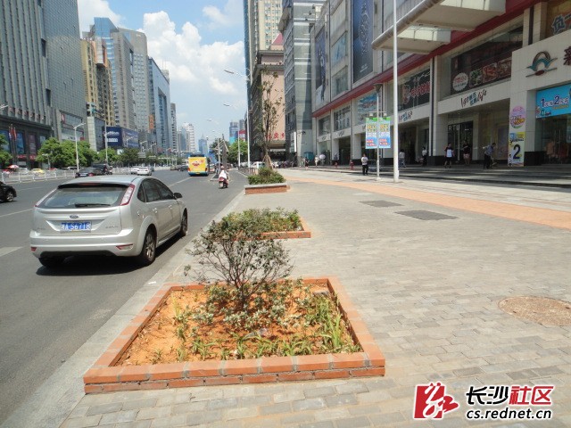 针对网友卫冬生反映的情况,红网记者走访调查了长沙市五一大道、解放西路、坡子街、二王街等道路,发现确实不少道路没有树荫。有的道路只在花坛里种有零星花草,有的稀稀落落的树苗已经枯萎,更有些则光秃秃没有任何花草……宽阔行人道,绿树成荫不见了。
