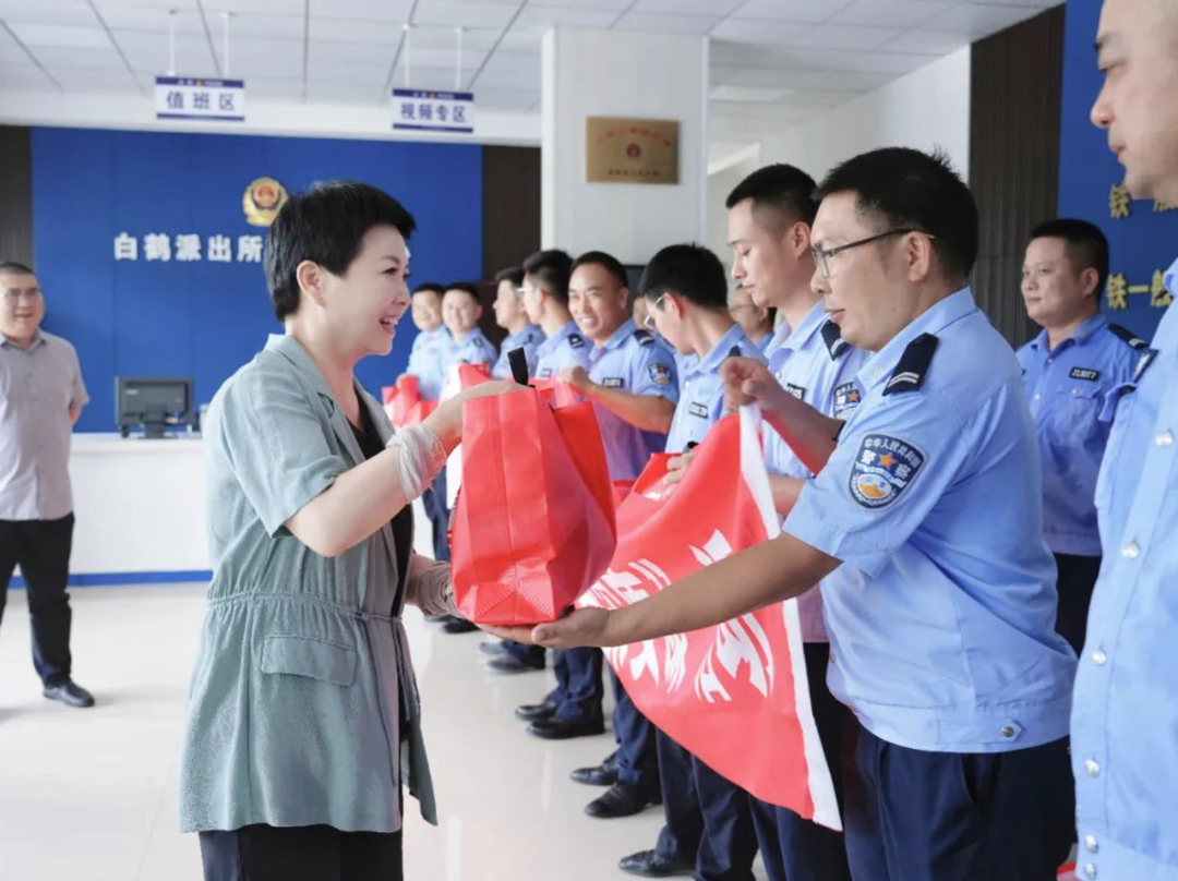在白鹤镇派出所,伍彩霞为高温下坚守岗位的民辅警送去防暑降温物资并致以慰问,充分肯定他们在维护辖区稳定、服务群众中的辛勤付出。她叮嘱民辅警在执勤中务必注意防暑降温,科学安排勤务,持续强化错峰、错时巡逻防控,确保各项安保维稳措施落实落细、直达末梢。