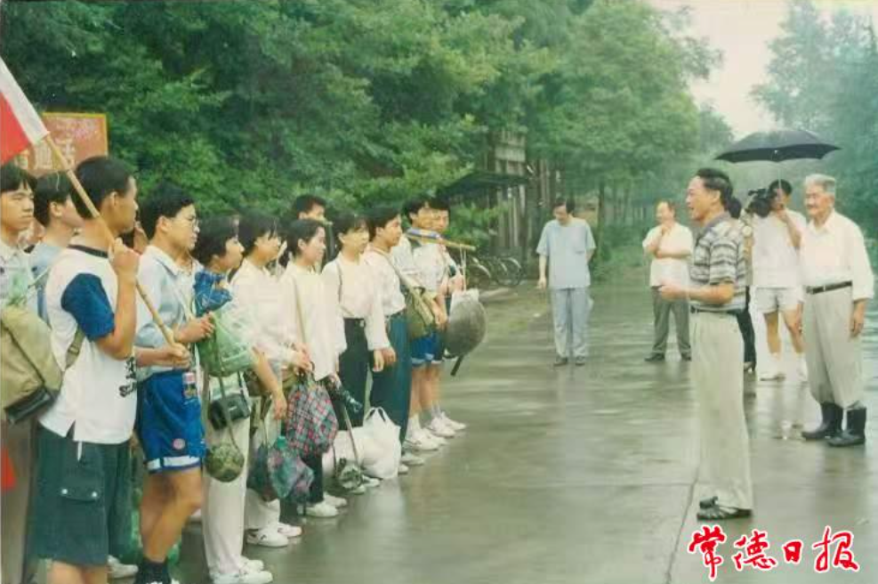 1997年上井冈山前,时任校长许成林、革命老人杜修经为实践教学队伍送行“1000多米海拔山路上的气喘吁吁、村民们‘现在的大学生还肯走红军路’的赞叹,都刻在了我的记忆里。”2021年,中国共产党成立100周年之际,2020级思政专业学子袁梦蝶跟着队伍探访湘鄂西及湘鄂渝黔革命根据地后,加入学校党的创新理论宣讲团。“在一遍遍红色故事的讲述中,我从心底萌生了一个梦想——参军去!接过先辈们手中的枪,为中国式现代化护航。”如今,她在某部服役。