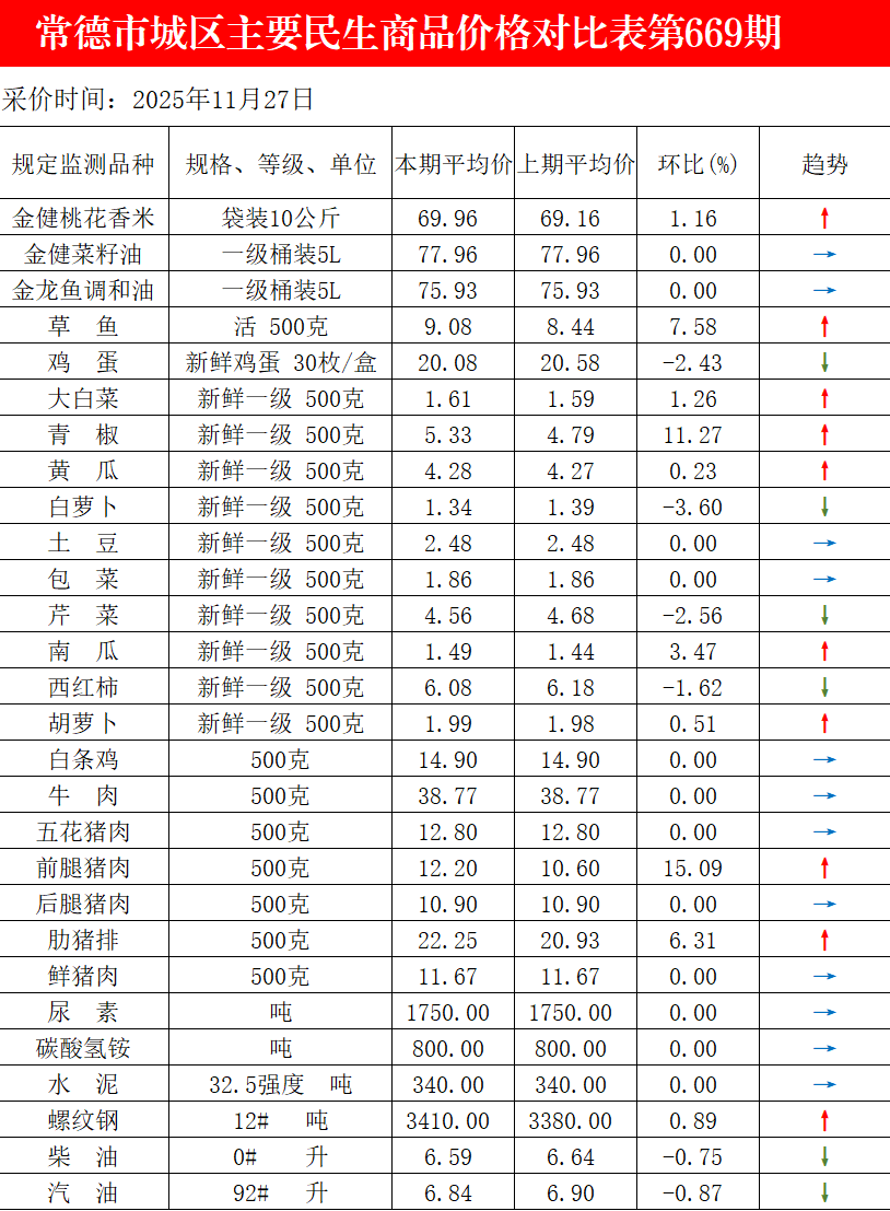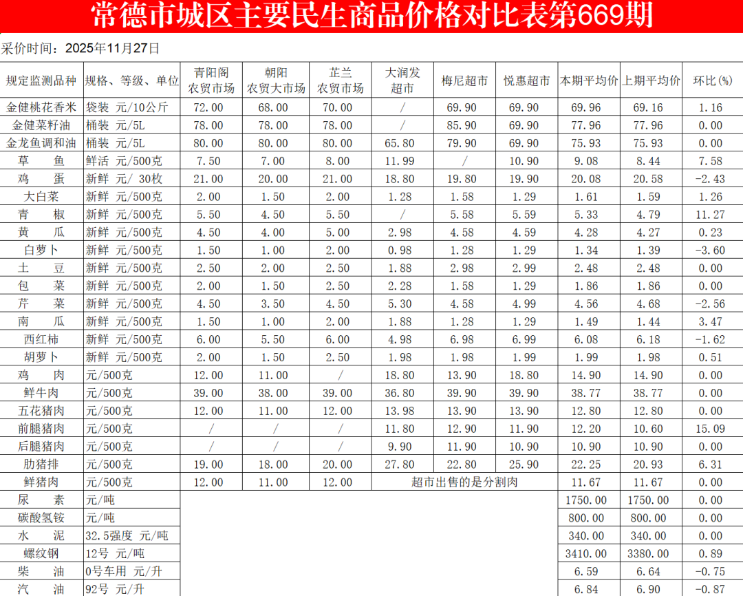 为方便群众了解民生商品市场价格动态,常德市发展改革委通过“常德发改”发布近期市城区主要民生商品价格情况。