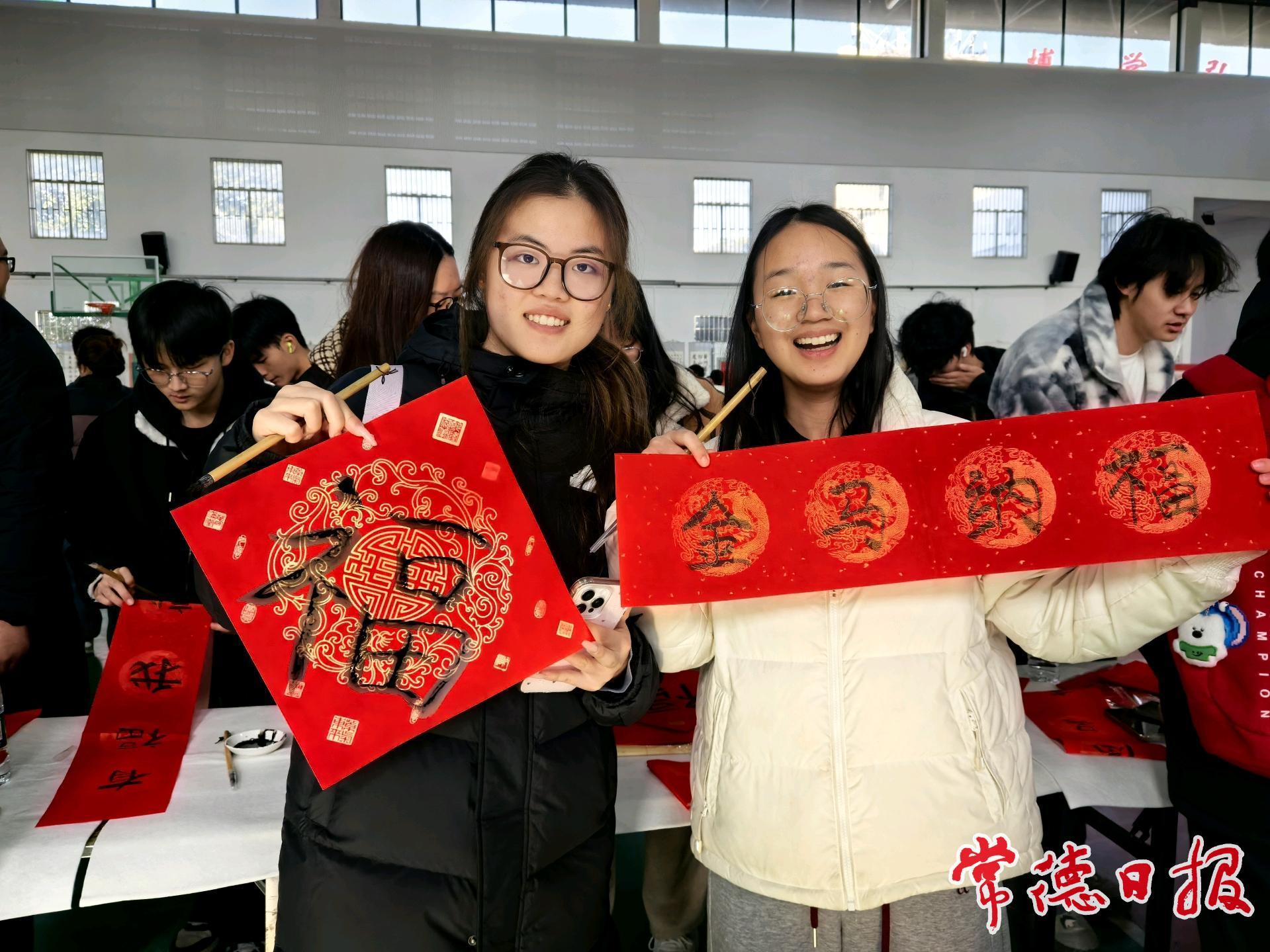 体育馆内处处洋溢着欢乐祥和的浓厚氛围。拿到心仪春联与福字的学生们,纷纷参与“新春祈福墙”留言、“笔墨印象”打卡拍照等特色活动,既为活动增添了趣味性,也进一步扩大了活动的传播力,让中华传统文化的暖意与新春的喜庆气息在校园中充分传递。