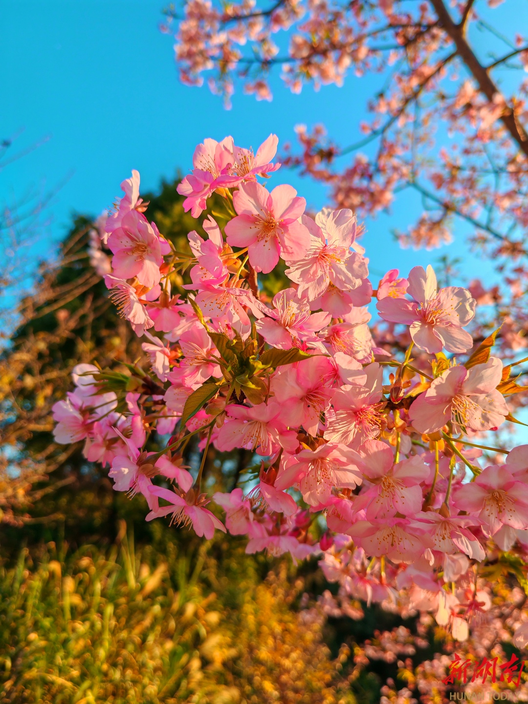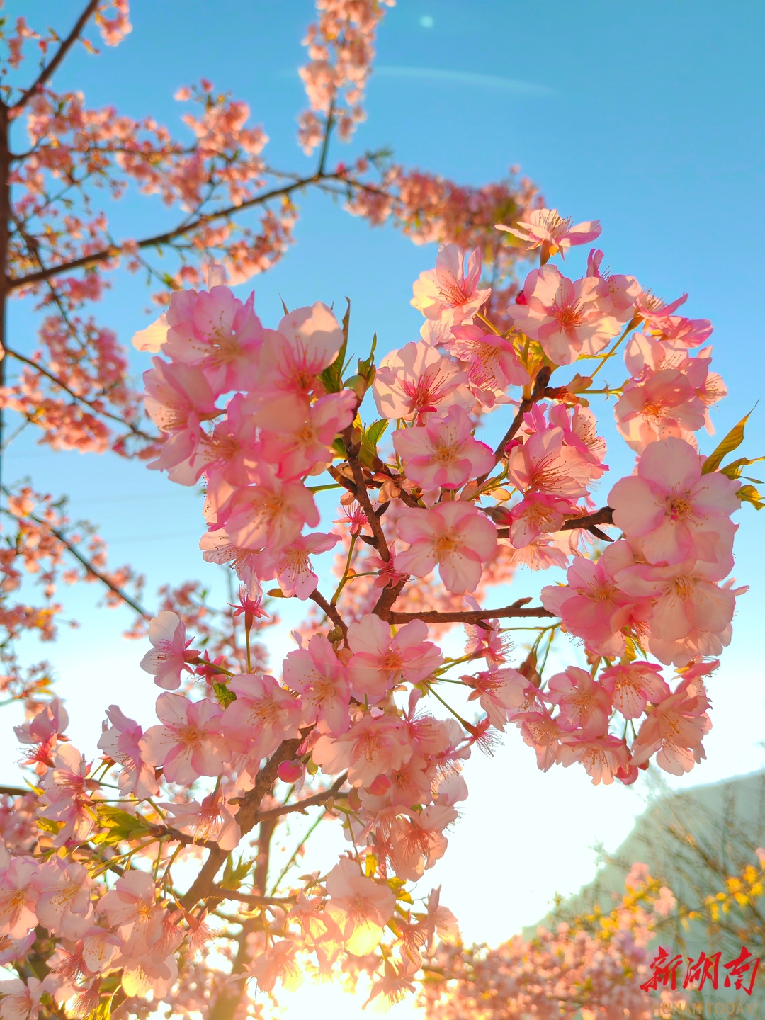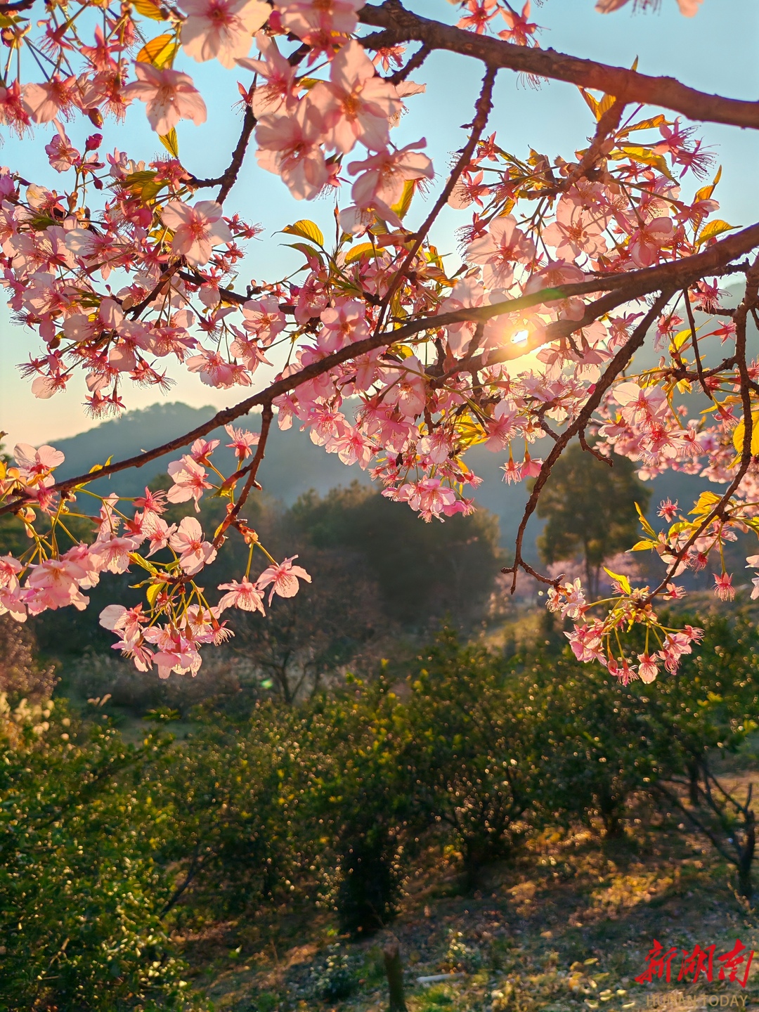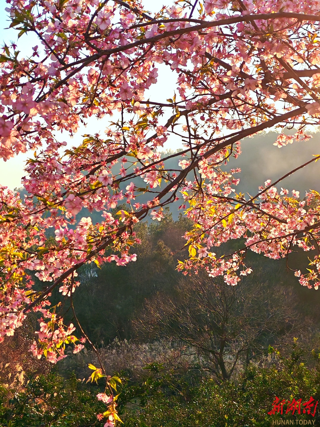 走下山坡,你会看见,淡金色的阳光斜斜地切过枝丫,花瓣便有了光的骨骼。一朵花,就是一小片被阳光穿透的粉玉;一树花,便是一条静默流淌的、发光的粉色小河。风来时,花枝颤动,那光便碎在空气里,细细地、凉凉地,落在肩头。