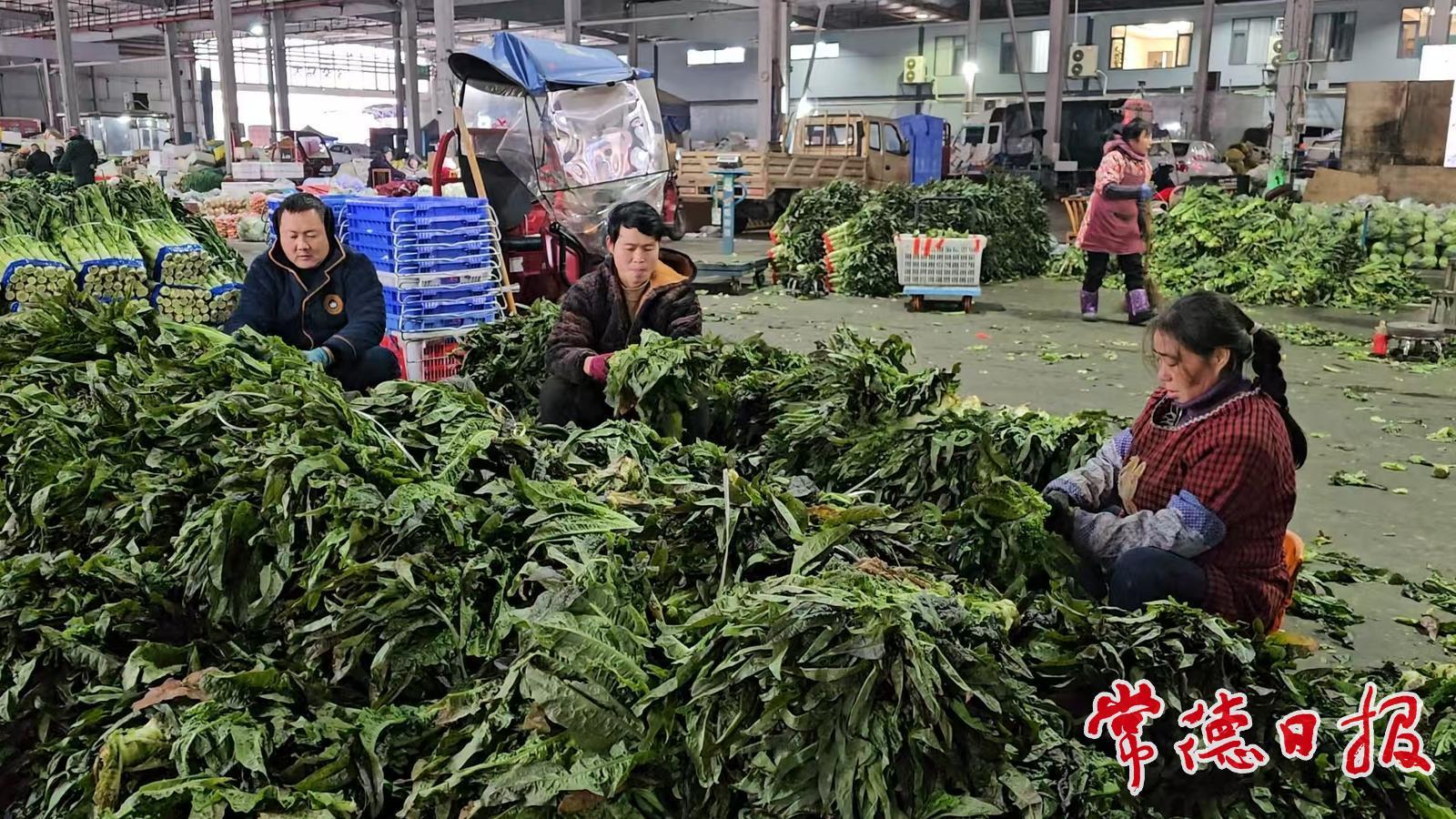 作为湘西北区域最大的综合性农产品一级批发市场,常德国际农产品交易中心内更是一派繁忙,档口商户们正在分拣、打包新鲜莴笋,一箱箱蔬菜整装待发,即将运往各大市场。