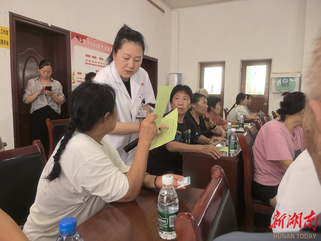 2024年8月,澧县医保局副局长蔡云在澧南镇上官宫村卫生室宣讲门诊综合改革政策。