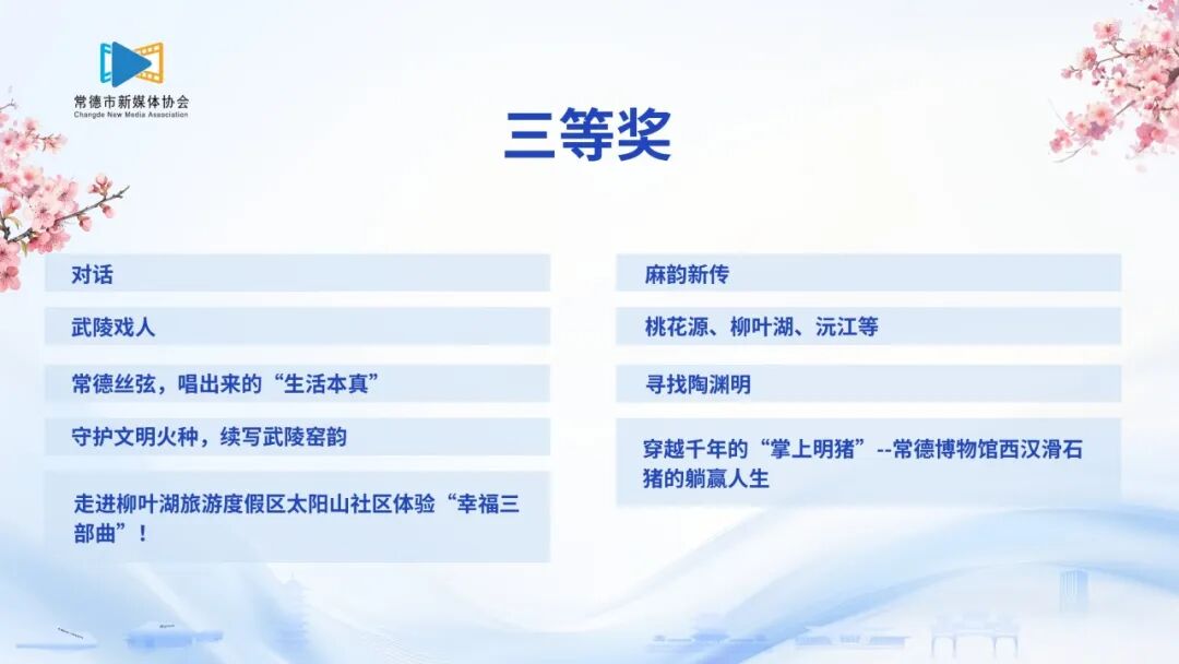 《老西门:在旧时光里邂逅新浪漫》《灵醒常德》《常德~它值得!HereisChangde,acitylikeapoem》《东山峰看日出逛茶园》《城市夜景》《常德原创歌曲<相约常德>MV》《显山露水》《一碗常德粉,千年沅澧香》《街巷藏情》《最美鼎城,打卡沅江风光带》《常德名字的由来》《河街的国庆之夜》《我骄傲我是常德人》《湖湘手艺——熏香篇》《港中坪智慧农田变形记:小田变大田,手机管灌溉》《桃花源里看青春——用一针一线绘出乡村振兴新画卷》《千年擂茶:非遗里的博物智慧与科学密码》《港中坪的四季密码》《端午趣游港中坪》《开学第一课,我们把“动物园”搬进了山区学校》《桃花源里灵醒常德等你来晒,看记者第三视角全记录“东江村排·益丰杯”vlog,好玩的都在这里啦!》《藏在博物馆里的常德烟火气》《秋韵常德》