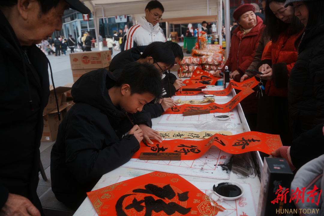 活动现场还设有多个互动区域。在书法老师的案台前,等待春联的市民有序排队;年俗市集展示着传统手工艺品与年货;特别设置的“互动抓年猪”趣味游戏引来不少家庭参与,欢笑声此起彼伏。