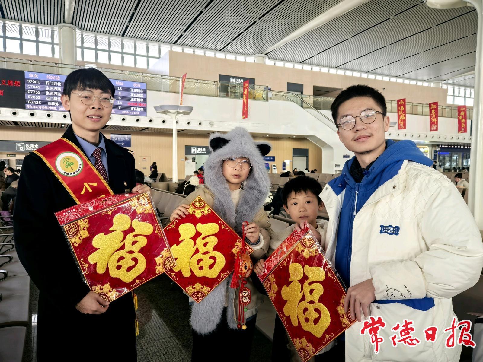 20岁的刘辉峻,正带着11岁的堂妹孙湘玥、8岁的堂弟孙湘杰,好奇地打量着候车厅的环境。刘辉峻是第一次来到常德,此次他是特地前来接弟弟妹妹回家过年。他们准备乘坐G2430次高铁经重庆返回内江。“常德人特别热情,问路时大家都耐心指引,城市也干净整洁,给我留下了特别好的印象。”刘辉峻笑着说。工作人员送上3份大红“福”字,细细叮嘱他们旅途注意安全,有任何需求可随时寻求帮助。“谢谢叔叔!”孩子们脆生生的道谢声,与新春的祝福交织在一起,让这趟归家之旅暖意融融。