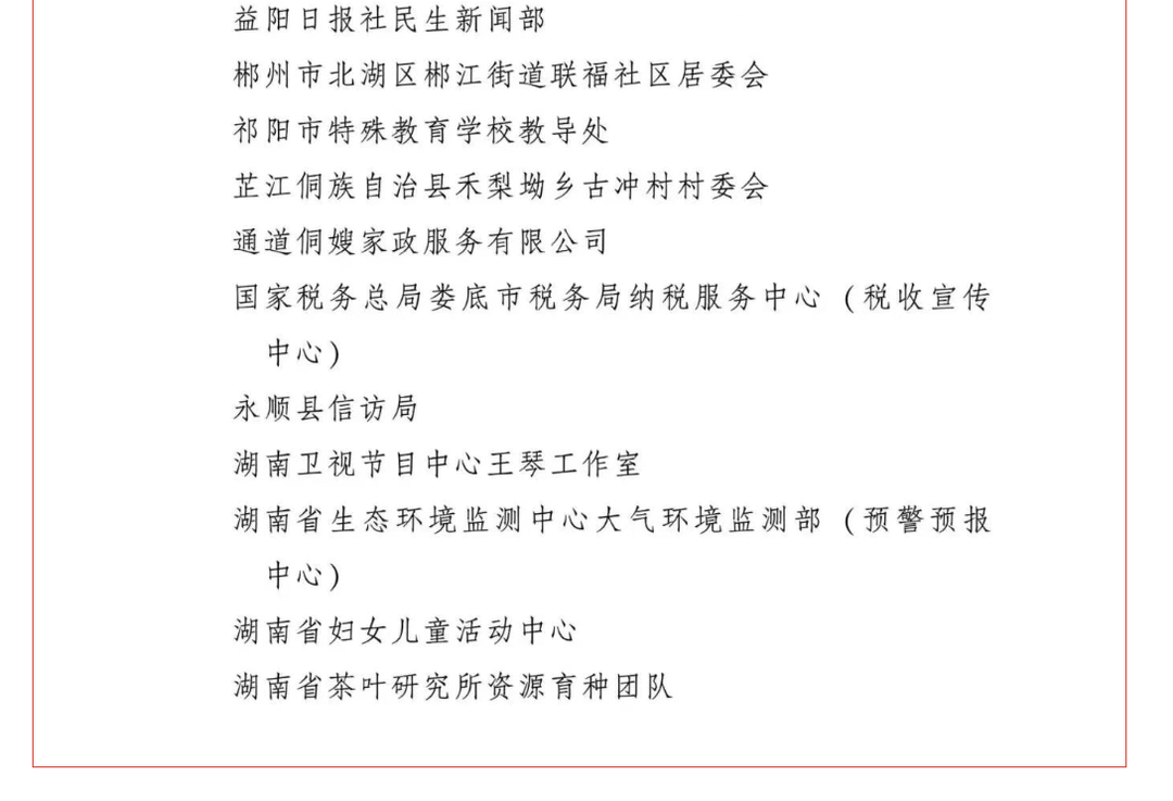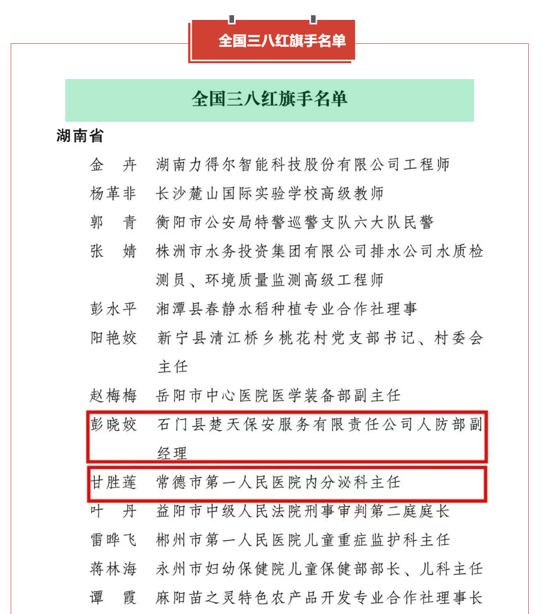 全国妇联决定,授予兰臻等9人全国三八红旗手标兵称号,授予阮祥燕等598人全国三八红旗手称号,授予中国人民抗日战争纪念馆社会教育部等400个单位全国三八红旗集体称号,授予首都医科大学附属北京同仁医院耳鼻咽喉头颈外科等600个单位全国巾帼文明岗称号。