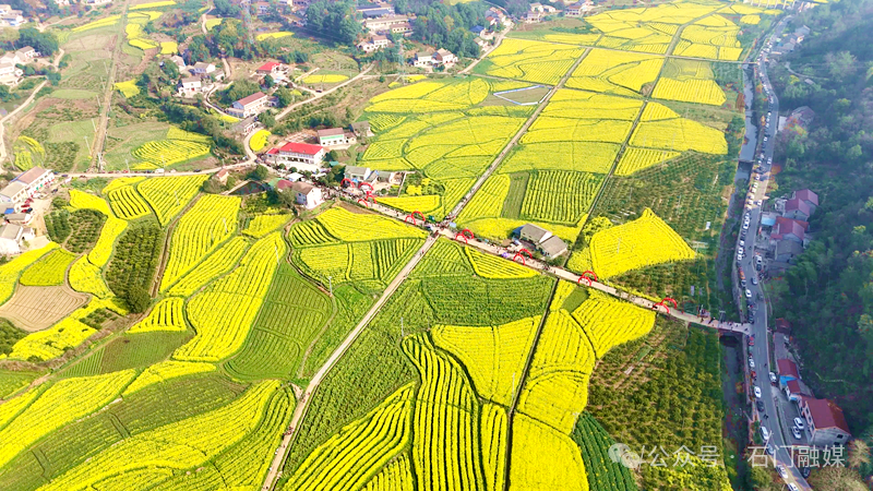 春风拂过,万亩油菜花海翻涌成潮,满目金黄、一望无际,金色花浪随风起伏,花香沁人心脾,与蓝天、村落、田垄相映成趣。游客漫步花间小径、驻足打卡拍照,尽享田园风光与春日惬意。“德甲”石门队的球员们也来到现场,与游客热情互动,为油菜花艺术季助阵添彩。